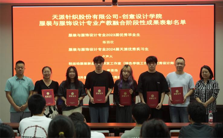 为表彰天派针织与创意学院服装与服饰设计专业产教融合阶段性成果,会上,天派针织股份有限公司董事长王晋围与创意设计学院副院长华丽霞为“天派校外紧密型实训基地”的2020级服装与服饰设计专业优秀毕业生练羽欣、2022级服装与服饰设计专业优秀实习生卢声大、2023级服装与服饰设计专业优秀特色学徒生余杰、李荟炀,以及优秀指导教师赵捷颁发荣誉证书。