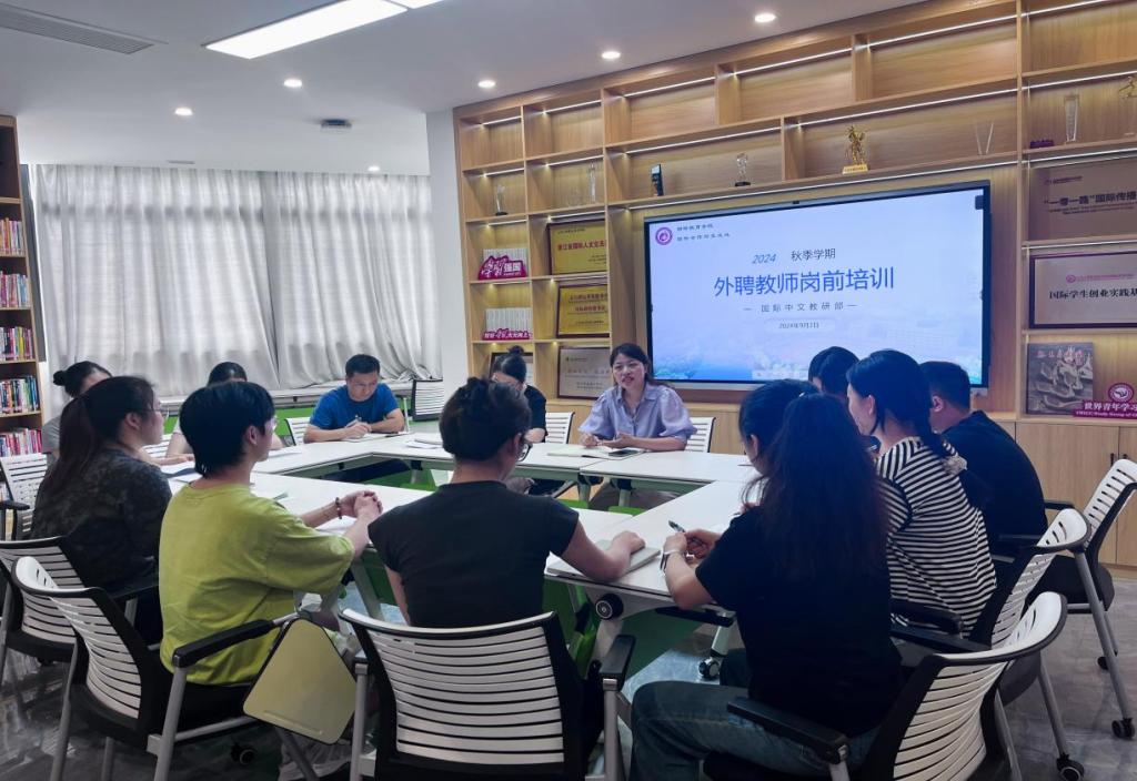 9月2日下午,2024年秋季学期外聘教师岗前培训在香樟书院一号楼国际创客园举行。国际教育学院副院长出席并作讲话,相关科室负责人做了工作指导,全体外聘教师接受培训学习,会议由学院教研部负责人主持。