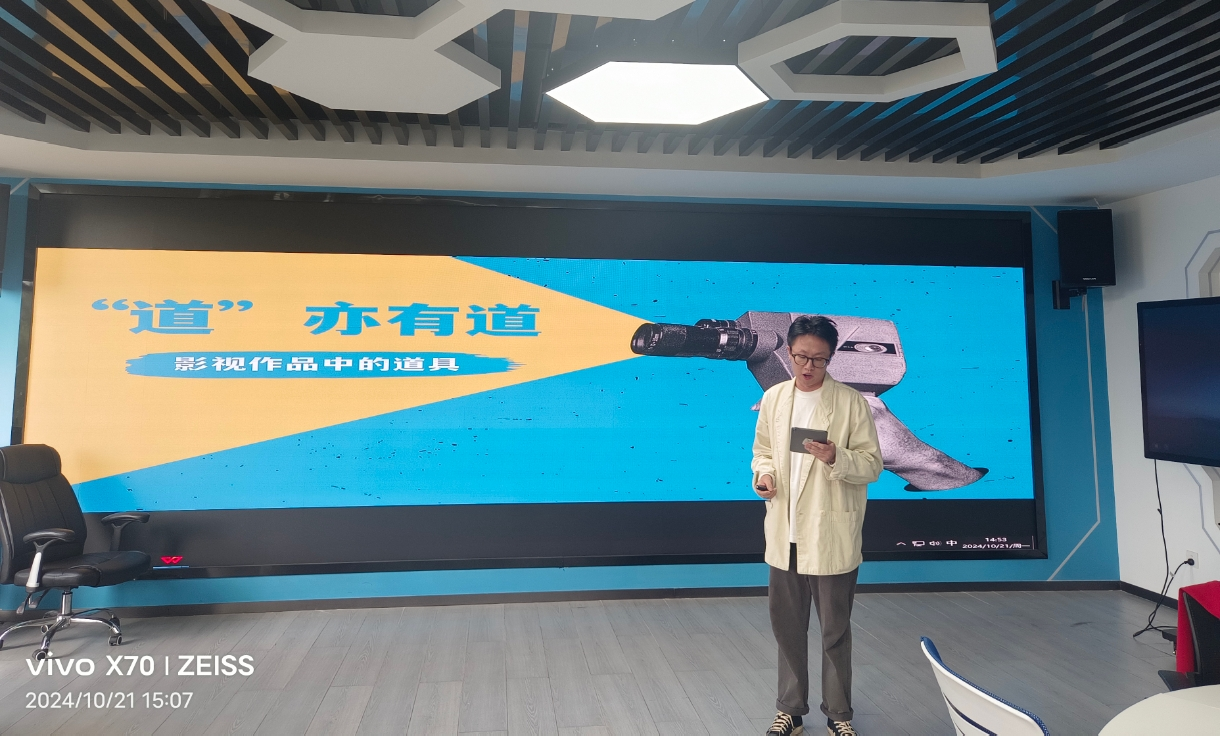 辛岛老师以生动的案例和深入浅出的讲解,向在座的老师展示了道具在影视作品中的独特作用。他强调了道具不仅是物质实体的呈现,更是角色性格、时代背景和剧情推进的重要载体。通过一系列经典影视片段的解析,辛老师引导大家从道具的材质、造型、寓意等多角度进行深入探讨,揭示了道具背后的文化内涵和象征意义。