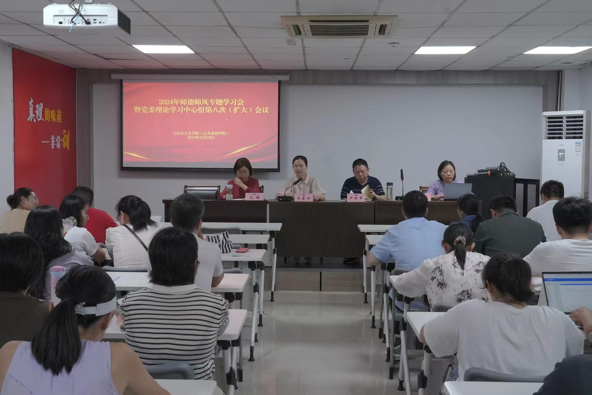 10月18日下午,马克思主义学院在学院大会议室召开2024年师德师风专题学习会暨党委理论学习中心组第八次(扩大)会议,学习习近平总书记关于教师队伍建设的重要指示批示精神和习近平总书记在全国教育大会上的重要讲话精神,开展教师师德师风专题学习。学院全体教师参加会议,党委书记吴赛男主持。
