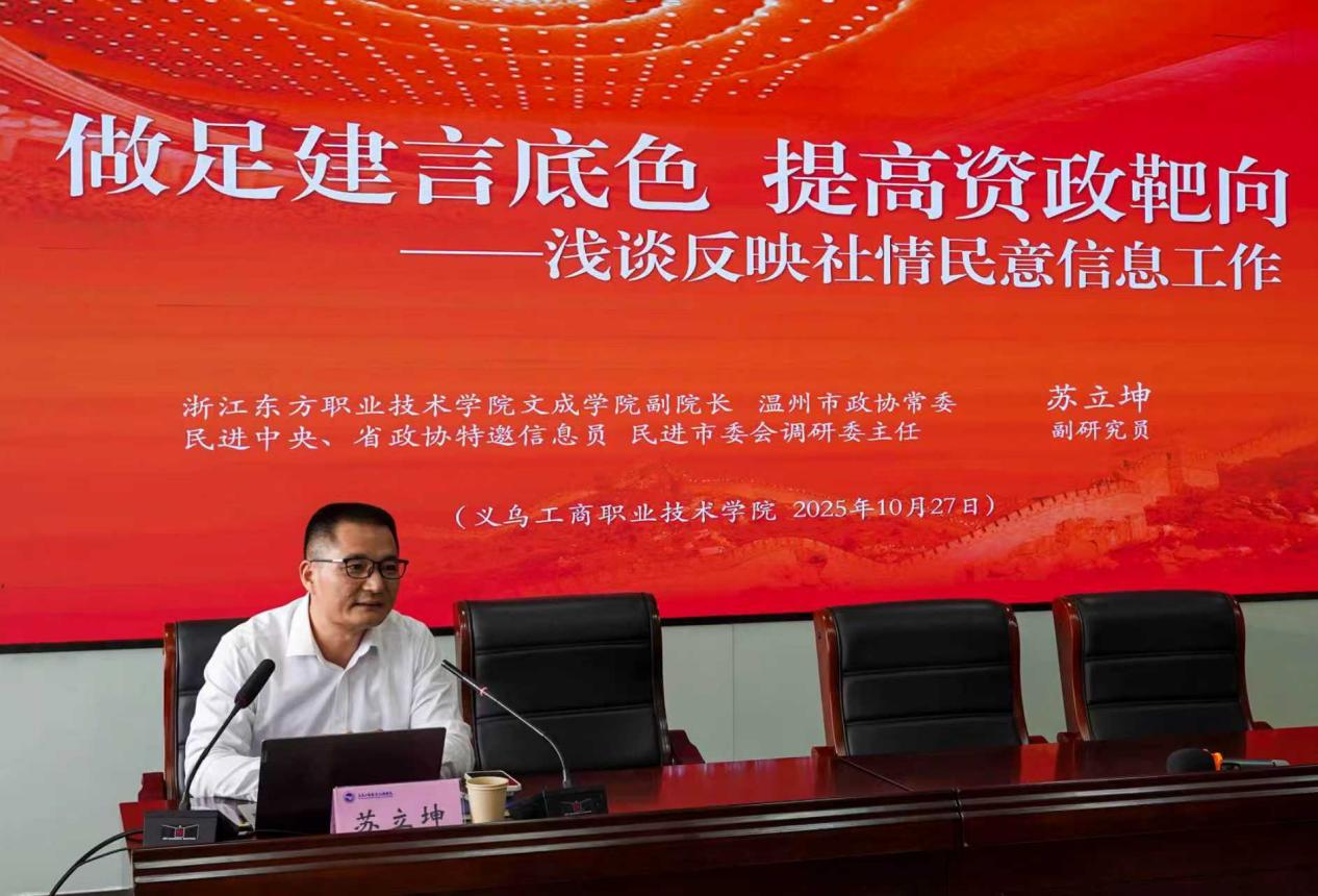 为提升学校统一战线成员参政议政、服务发展的能力水平,进一步提高学校统战工作影响力,10月27日下午,由校统战部、科技处、经济管理学院(“义商智汇”社情民意信息工作室)联合主办的反映社情民意信息工作专题指导讲座在教师发展中心举行。讲座特邀浙江东方职业技术学院文成学院(航空飞行学院)副院长、政府公共政策与文化治理研究中心主任、民进中央参政议政特邀信息员、浙江省政协特邀信息员、温州市政协常委苏立坤作专题指导。义乌市政协、市民主党派代表、无党派人士代表及学校教师等90余人参加。