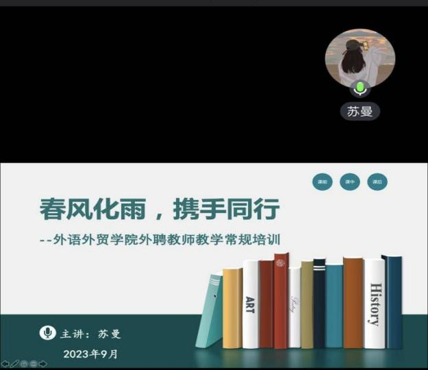会议伊始,督导组负责人苏曼为外聘教师开展“春风化雨,携手同行”主题教学常规培训。苏曼老师从教学实践各环节出发,聚焦资料准备、课堂教学、课程思政几个方面,生动阐释了如何上好一堂课、如何开展课堂管理、如何贯彻立德树人的综合教育理念等事关教学活动开展的重要问题。