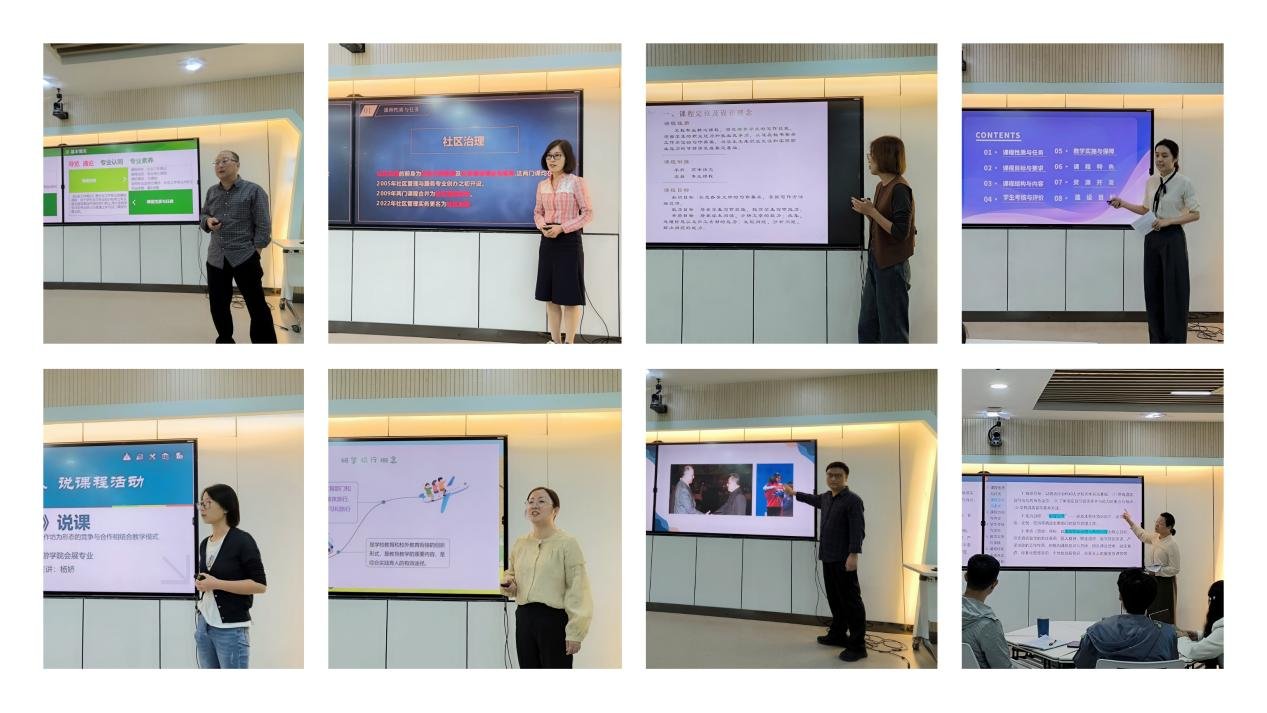 活动现场,我院酒店管理与数字化运营、旅游管理、会展策划与管理、现代文秘和社会工作五大专业的各课程负责人分别就各自课程进行了详细的介绍和解读。每位课程负责人从课程性质与任务、课程目标与要求、课程结构与内容、学生考核与评价、教学实施与保障、课程特色、资源开发以及建设目标等八个方面进行了深入剖析,充分展示了各自课程的独特之处和亮点。