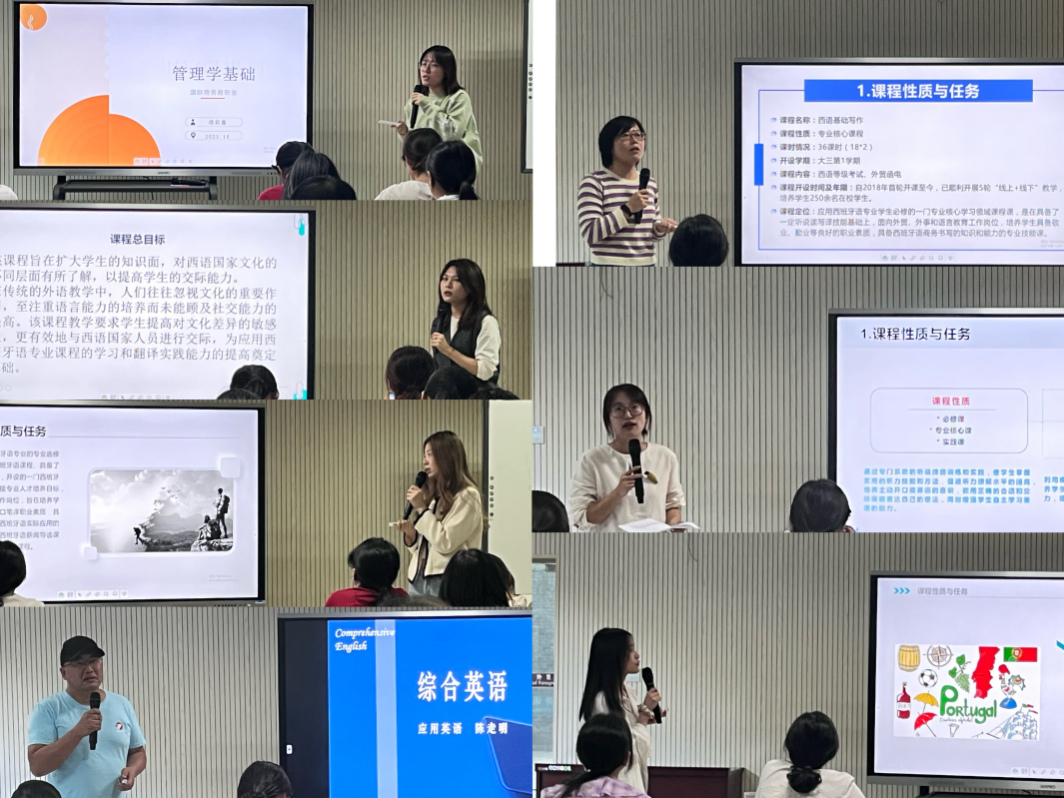 本次活动共有来自国际经济与贸易、现代物流管理、国际商务、应用英语、应用西班牙语5个专业的14名课程负责人参加,学院全体教师到场观摩。参与教师结合课程内涵建设、课程教学标准修订等工作,从课程性质与任务、课程目标与要求、课程结构与内容等8个方面介绍了课程建设与发展情况,课程设计思路清晰,目的明确,充分展现了我院教师的专业素养与教学风采。